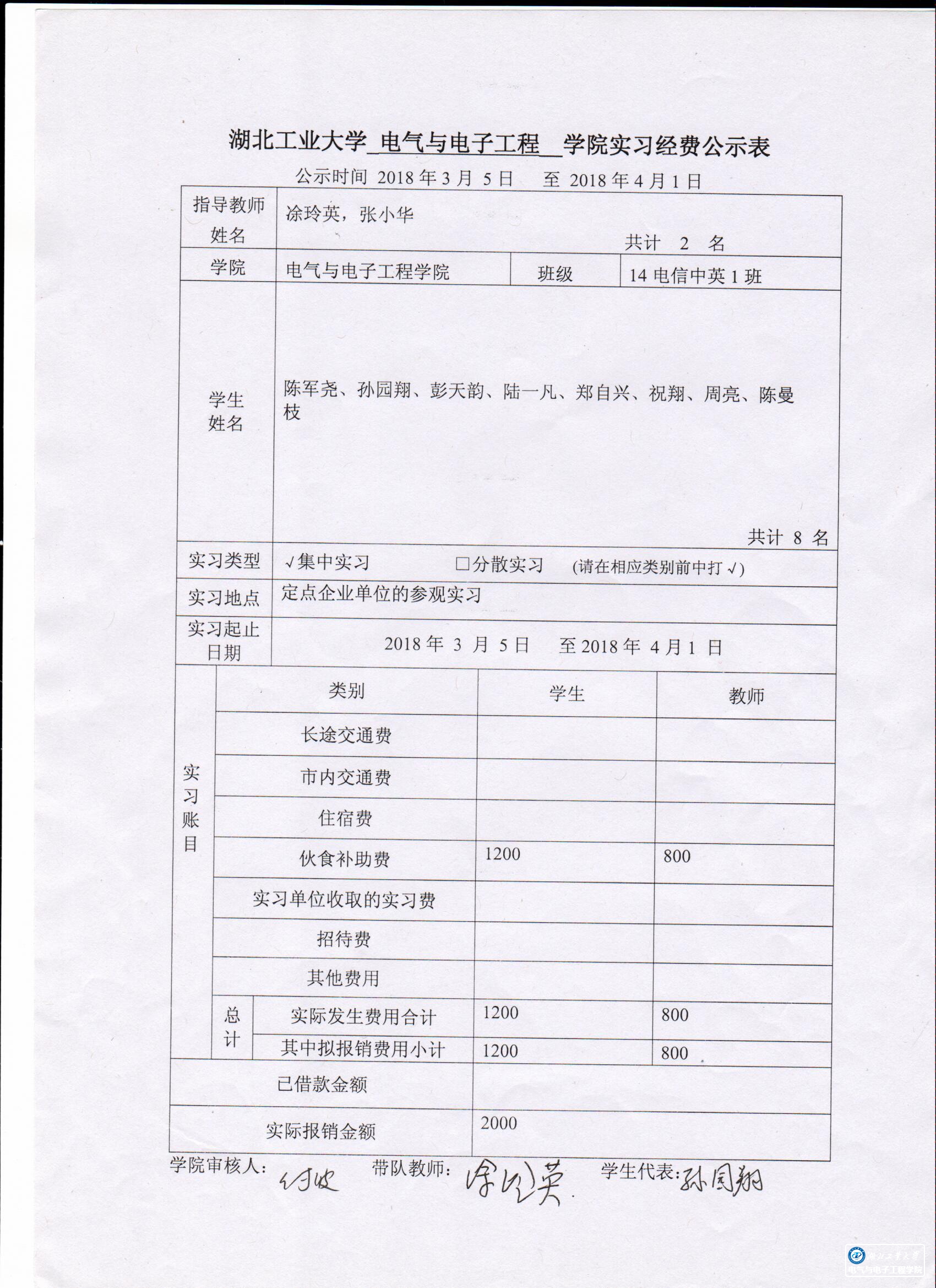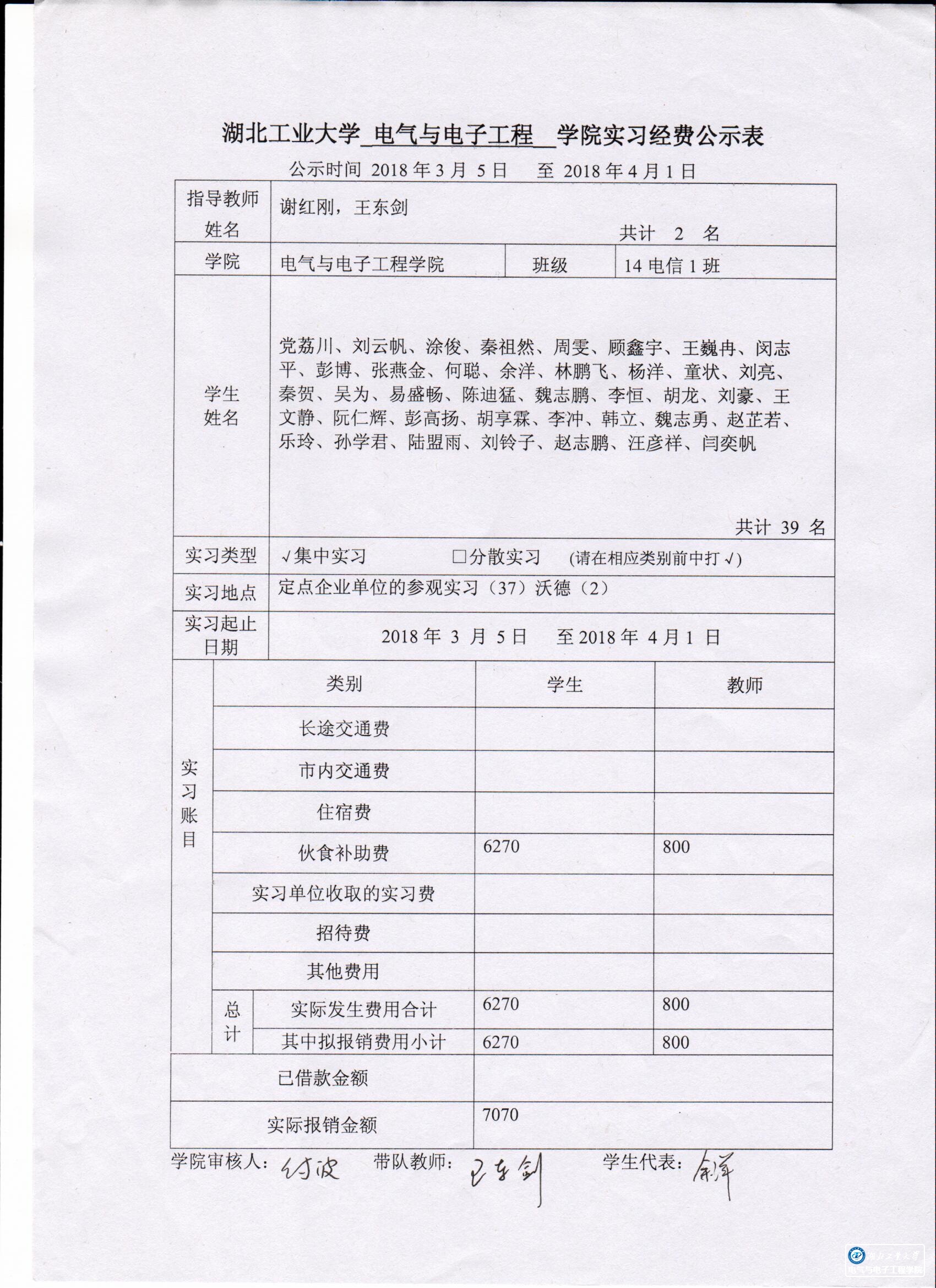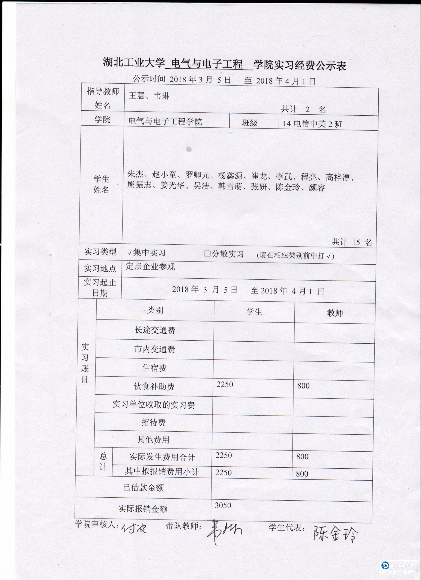 附件:《湖北工业大学电气学院实习经费公示表》2018年3月6日