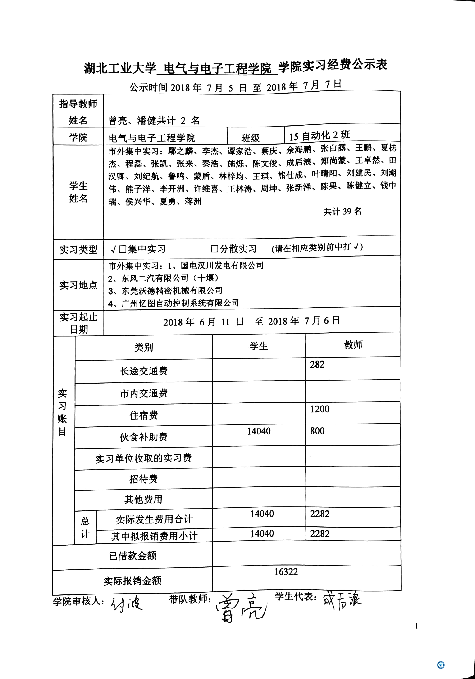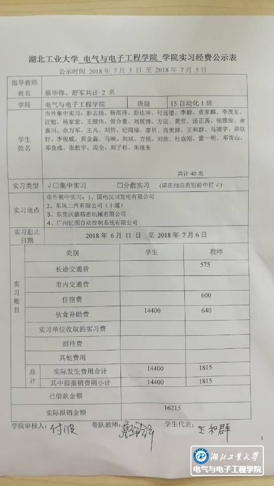 附件:《湖北工业大学电气学院实习经费公示表》2018年7月4日